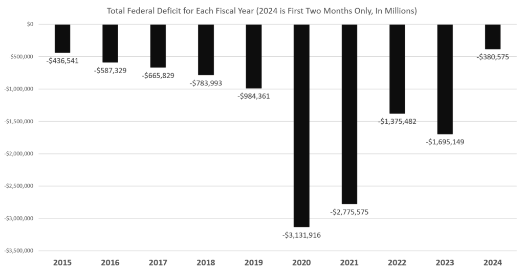 According to the Treasury Department’s latest monthly release, the overall fiscal deficit for fiscal year 2024 (which began on October 1) has already grown to more than $380 billion.