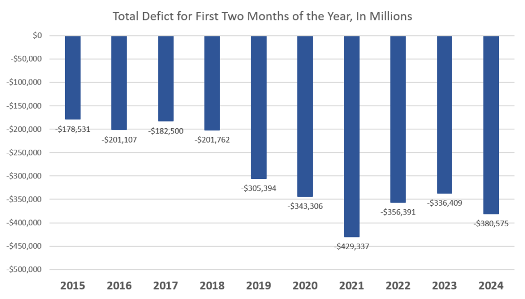 Comparing the same two-month period in the previous decade, the data also suggest that deficit spending in 2024 will be second only to the Covid years in 2020 and 2021. In the first two months of fiscal year 2021, the deficit stood at more than 429 billion dollars.