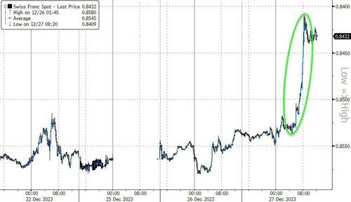 Swiss franc surges against US dollar – second biggest ‘absolute safe haven’ of the year outside FOMC/ECT days,
