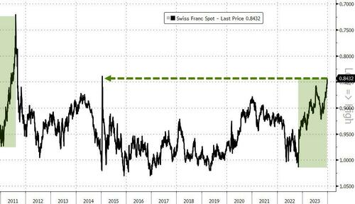 This lifted the franc to its strongest level since the SNB intervened in January 2015. 2023 saw the Swiss franc’s strongest annual gains against the dollar since 2010.