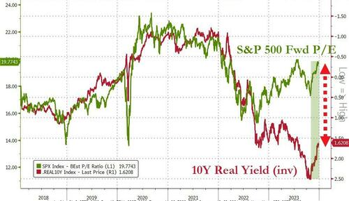 And, while over the past couple of months real yields have been falling as P/Es have been rising, they remain dramatically disconnected.