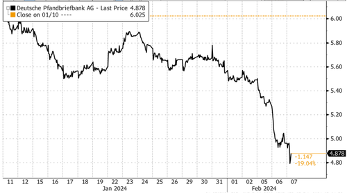 Deutsche Pfandbriefbank AG has high exposure to the US CRE market. The bank’s 150 million euro ($161 million) Tier 2 bond was priced 17.4 cents lower at 52 cents to the euro on Tuesday, Feb. 6 – by far the biggest intra-session decline. A smaller additional €300 million bond fell 9.5 cents – an even sharper drop after the loss the bank posted in the wake of Credit Suisse’s AT1 write-off last year.