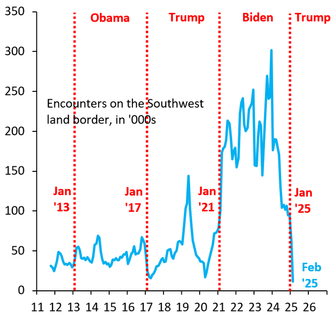 At this point in the business cycle, however, a tariff-induced price increase would likely force consumers to cut back on purchases and businesses to cut back on investment. Let’s leave the tariff debate aside altogether: fiscal expansion and immigration were two strong growth drivers under the Biden administration.