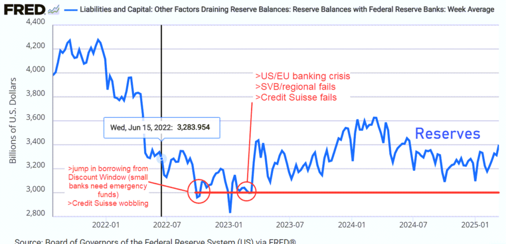 The Fed has been pumping reserves (liquidity used only by banks to settle payments between themselves) through quantitative easing (QE) programs for the two years after March 2022. However, even reserves are counted as leverage on bank balance sheets, and banks have limits on how much they can hold.