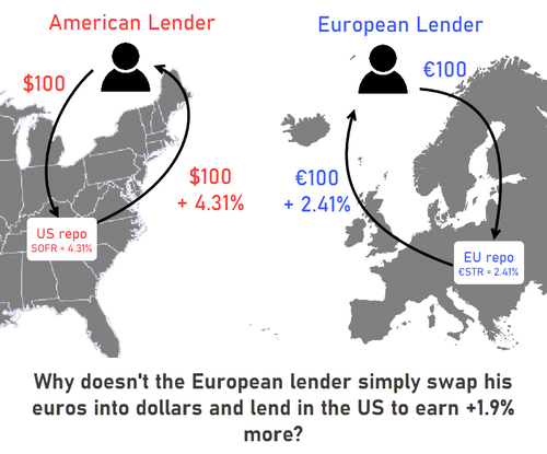 Let’s say I’m a European investor who earns 2.4% by lending euros within Europe. What’s to stop me from converting my euros into dollars, lending the dollars at a 4.3% yield in the US, and then converting them back into euros to earn a higher return? Absolutely nothing, but this strategy carries risks.