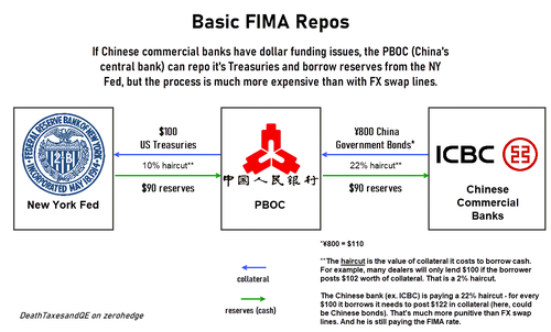 It is also known as the “China Repo Facility,” as Chinese banks need dollars, and the People’s Bank of China (PBOC) has huge reserves of U.S. Treasury bonds—$760 billion today. Rather than depreciating the yuan or selling its dollar reserves in a tight situation, the PBOC can use them to raise liquidity through repos.