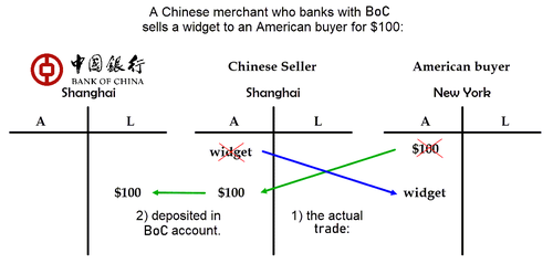 A Chinese trader who receives $100 from a transaction with an American will deposit that money into his account at the Bank of China (BoC).
