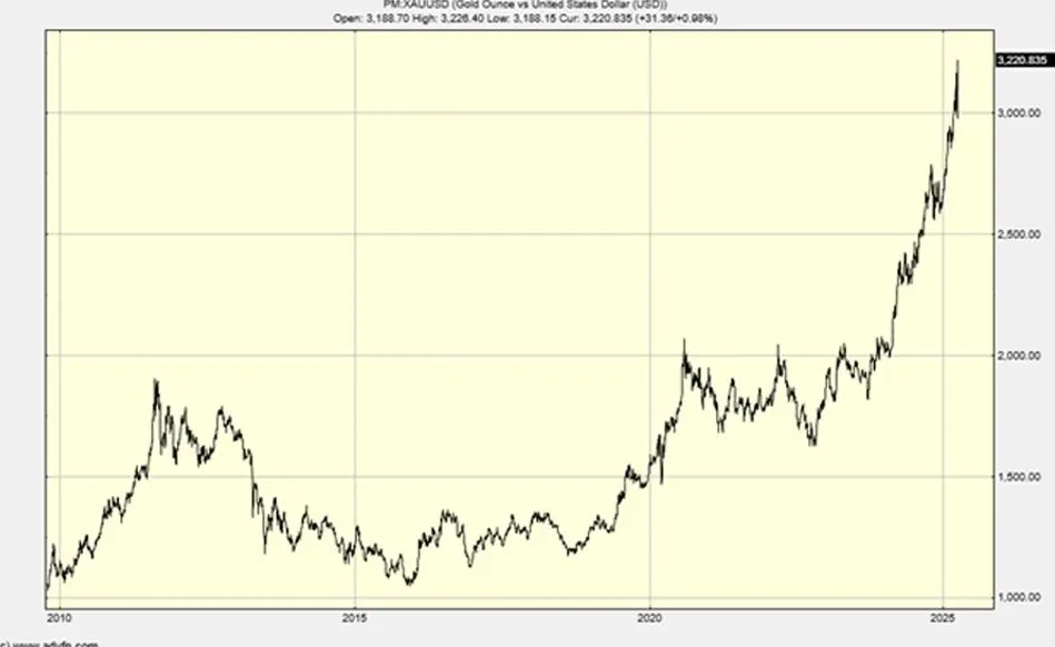 In its simplest form, gold is a strategic necessity. Here we are, with global tensions rising. And so, gold has followed a sharp upward trajectory. Gold hit a new all-time high of over $3,200 an ounce on Friday, April 11.