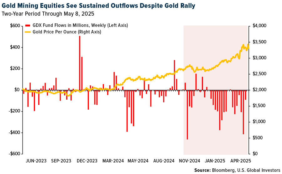 But here’s where things get interesting — and puzzling. While gold prices continue to hit new all-time highs, gold mining stocks have seen consistent outflows.