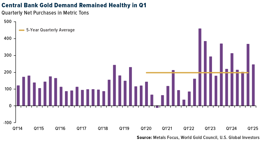 Central banks have been leading the massive gold buying spree for 15 years. In the first quarter of 2025, central banks added 244 metric tons of gold to their official reserves, according to the World Gold Council (WGC).