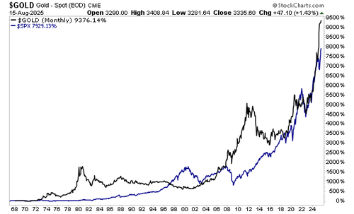 - Gold, since mid-1967, has outperformed the S&P 500 and the Dow Jones Industrial Average by a wide margin. During that time, gold has risen more than 8,300%, while the S&P 500 has risen 6,600%.