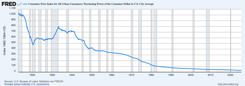 The chart below. Gold may not pay dividends or generate cash flow, but it retains purchasing power. And if there’s one thing the Fed has done well since it was given control of the U.S. dollar in 1913, it’s devalue the currency.