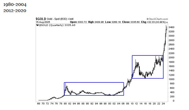 Note that the analysis is done in terms of decades here, not months or years. There are periods when gold does not move at all in nominal terms for years. The chart below illustrates some of these time periods.