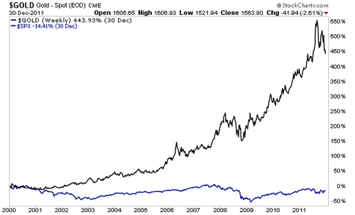 The bull market of the 2000s was much shorter, with gold only gaining 500%. However, it is worth noting that this was a period of deflation, not inflation. Furthermore, gold crushed stocks (blue line) during this period.