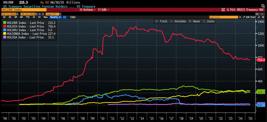 (Chart: Holdings of US Treasuries — Russia [blue line]• China [red]• India [yellow]• Brazil [green]• South Africa [purple])