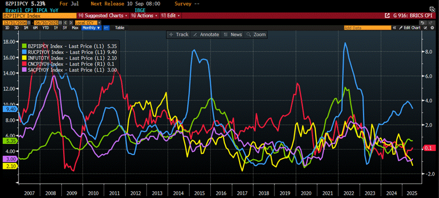 Third, they are not moving in sync — China has been stuck in deflation since the COVID health crisis, while Brazil and India are struggling with persistent inflation, and are trying to lower the exchange rate for their currencies against the dollar and manage debt.