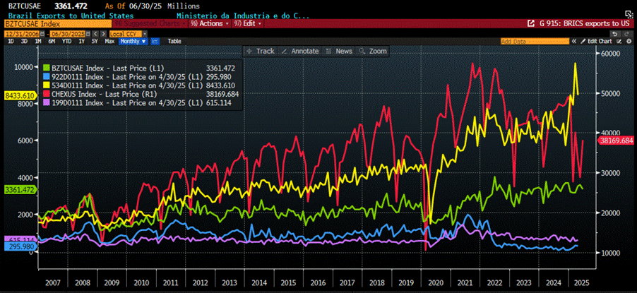 Exports from Russia (blue line); China (red line), India (yellow line), Brazil (green line), South Africa (purple line) to the USA.