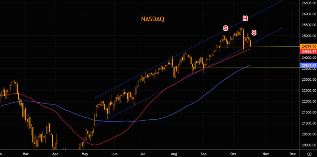NASDAQ – Head-and-Shoulder Pattern Possible? The NASDAQ is flirting with the lower bounds of the trend channel, while the 50-day moving average is around current levels. A slightly lower close could signal a breakout to the downside from the head-and-shoulders (HS) pattern. The 23,500 area (in futures) is the important support level to watch, with the 100-day moving average around the same point.