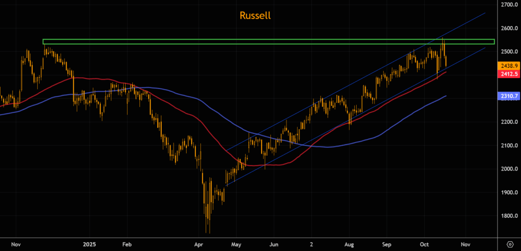 The Russell Correction So far, it’s just a failed breakout and a corrective move, but the last two candles are worth noting, which are quite negative. Russell futures have retreated to the lows of the trend channel, with the 5-day moving average slightly lower, while the 100-day is around the 2,300 area.